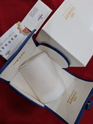 Scatola originale Tissot, ideale per conservare orologi. - Scatola esterna bianca con logo Tissot. - Scatola interna blu con cuscino porta orologio. - Include manuale e garanzia internazionale.