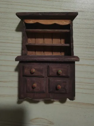 Mobiletto in legno scuro, ideale per arredare con un tocco rustico. - Due mensole superiori. - Base con quattro cassetti. - Pomelli colorati sui cassetti. pezzo d'arredamento tipicamente utilizzato per case delle bambole, diorami, o come oggetto da collezione.