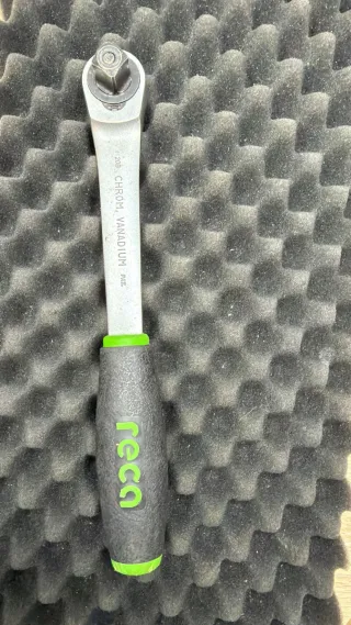Chiave a cricchetto con manico ergonomico e dettagli in verde. - Manico in gomma nera. - Meccanismo a cricchetto. - Dettaglio color verde sul manico e sulla testa.