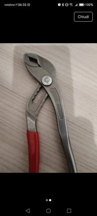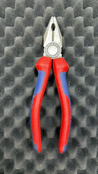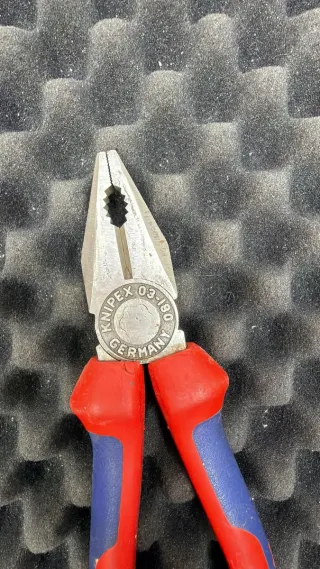 Pinze idrauliche marca KNIPEX, modello 03-180, prodotte in Germania. Impugnatura in gomma rossa e blu. Marca: KNIPEX, Modello: 03-180, Prodotto in: Germania, Colore dell'impugnatura: Rosso e blu.