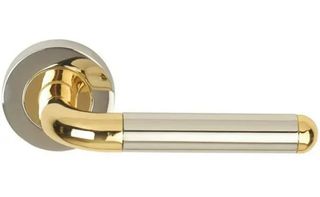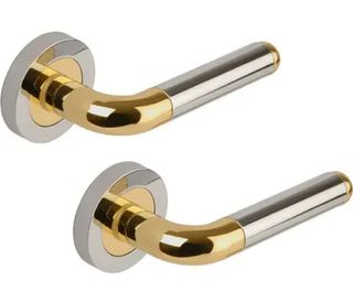 Maniglia per porta orbita su rosetta rotonda, in ottone lucido e cromato lucido. NUOVE MAI USATE Disponibilità 15 pezzi Coppia di leve di design Modello: Excel DH3630 53 mm vite su rosa rotonda Fori di fissaggio a 8 punti per resistenza e sicurezza Doppia finitura cromata lucida e ottone lucido Fissaggi con bulloni CONTATTATEMI PER MAGGIORI INFO