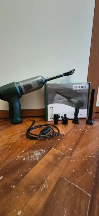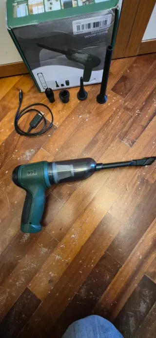 Aspirapolvere e soffiatore portatile, ideale per la pulizia. - Design compatto e leggero. - Accessori inclusi per diverse superfici. - Cavo di ricarica USB.