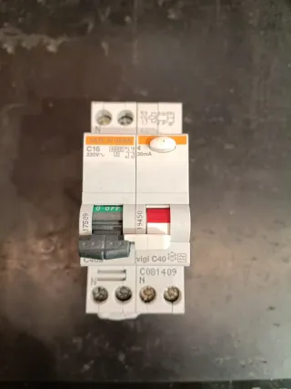 Interruttore magnetotermico Merlin Gerin. - Modello: C16 - Tensione: 230V~ - Sensibilità: 30mA - Codice: C081409