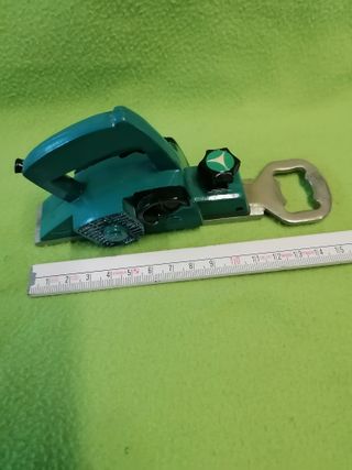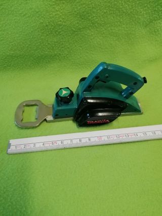 Cavatappi originale Makita, con un design unico a forma di pialla elettrica. - Colore: verde acqua e nero. - Logo Makita ben visibile.