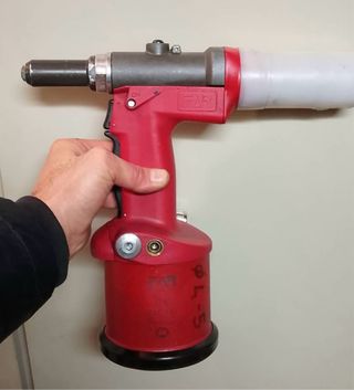 Rivettatrice pneumatica FAR modello RAC181. Completamente revisionata. Con sistema di aspirazione rivetto. Prodotta in Italia. - Colore rosso e grigio. - Impugnatura ergonomica. - Serbatoio integrato per rivetti.