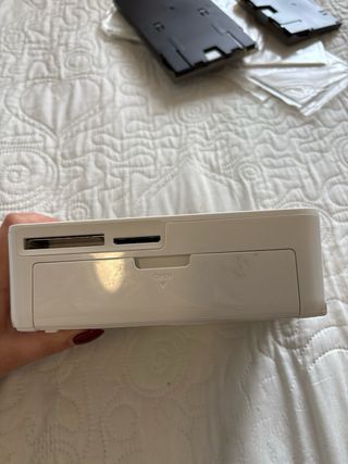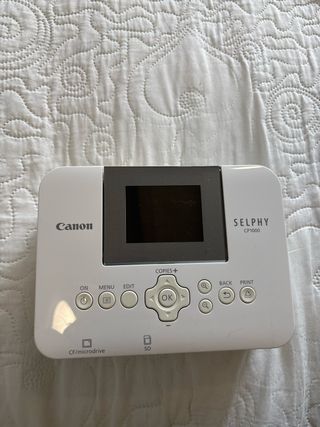 Stampante fotografica Canon SELPHY CP1000, ideale per stampe di qualità professionale. - Schermo LCD integrato. - Slot per schede CF/microdrive e SD. - Pulsanti di navigazione e funzioni (ON, MENU, EDIT, COPIES+, OK, BACK, PRINT). - Design compatto e portatile.