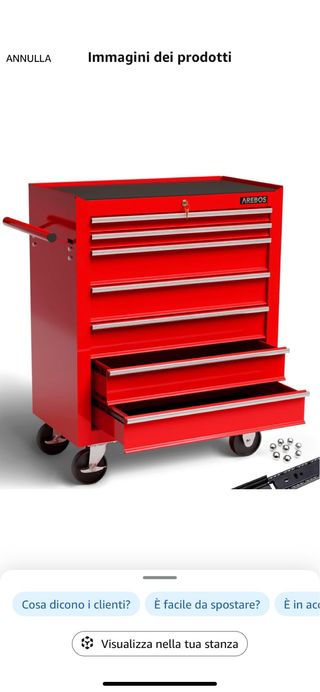 Carrello porta attrezzi AREBOS di colore rosso, con ruote per facilitarne lo spostamento. - Cassetti con guide scorrevoli. - Maniglia laterale per il trasporto. - Chiusura a chiave 7 cassetti Nuovissimo scatolato Pagaro 166€ non chiedete prezzi ridicoli