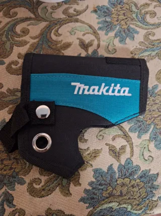 Custodia per avvitatore Makita in tessuto resistente. Per cintura - Colore nero con banda azzurra. - Logo Makita bianco. - Chiusura con bottoni a pressione e occhiello metallico.