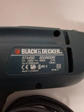 Marca: Black&Decker Modello/Codice Articolo: 374450 Potenza: 500/600W Tensione: 230V~ (corrente alternata) Frequenza: 50Hz Corrente: 2.7A Velocità a vuoto (n₀): 0-3000/min (giri al minuto), variabile Capacità mandrino: 13mm Certificazione: CE, BD2 (marchio di certificazione europeo) Prodotto in: Inghilterra Codice aggiuntivo: 9719-7 Ottime condizioni