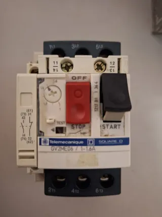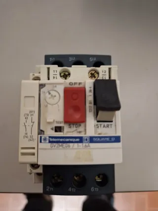 Salva motore Telemecanique Schneider. - Modello: GV2ME06 - Range di regolazione: 1-1.6A - Tensione nominale: 500V - Contatti ausiliari: 1 NO + 1 NC interruttore automatico magnetotermico TeSys GV2ME06 di Schneider Electric. È progettato per la protezione dei motori elettrici. Ha un intervallo di regolazione della protezione termica da 1 a 1,6 A. Include controllo start-stop tramite pulsanti. È un dispositivo a tre poli con morsetti a vite.
