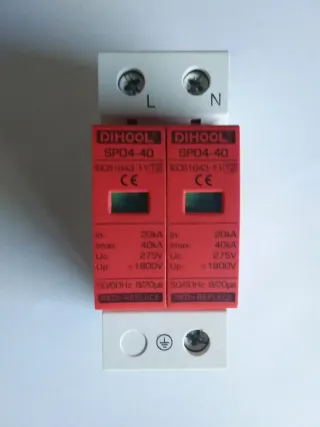 Coppia di scaricatori di sovratensione DIHOOL SPD4-40. - Modello: SPD4-40 - Corrente nominale (In): 20kA - Corrente massima (Imax): 40kA - Tensione nominale (Uc): 275V - Tensione di protezione (Up): ≤1800V - Frequenza: 50/60Hz - Tempo di risposta: 8/20µs - Indicatore di stato: RED-REPLACE
