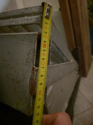 È in ferro zincato. Al di sotto sono stati applicati dei piedini. Misure: 138 X 53 X 8,5 Dall'esterno al primo buco 19 Buco buco 66 Buco buco 37 Dall'ultimo buco all'esterno 17