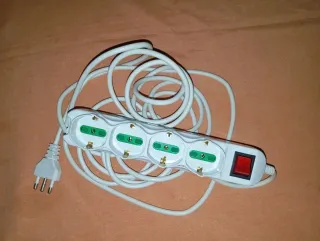 Ciabatta multipresa bianca con cavo. - Quattro prese elettriche. - Interruttore di accensione/spegnimento rosso. - Spina Schuko. - Cavo bianco lungo.