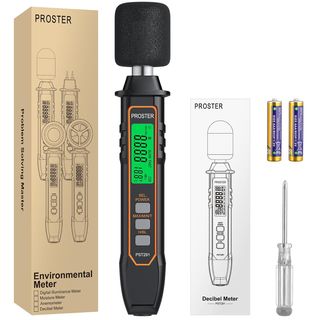 Misuratore di decibel digitale PROSTER PST291, ideale per misurare i livelli sonori. - Range di misurazione: 30dB - 130dB. - Funzioni MAX/MIN/T e H/BL. - Display LCD verde. - Include batterie e cacciavite.