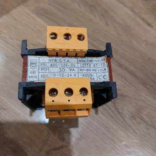 Trasformatore di marca NEW C.T.A. con potenza di 30 VA. - Primario: 400-230V - Secondario: 0-12-24V - Frequenza: 50-60 Hz - Modello: TMS1K0.03 - Lotto: 97-10 - Classe di isolamento: Cl.B - Certificazione CE