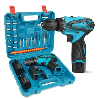 Trapano avvitatore elettrico con batteria al litio e valigetta. - Colore: blu e nero. - Include batteria e caricabatterie. - Valigetta porta attrezzi.