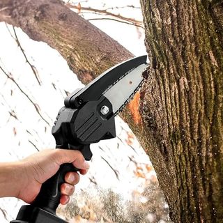 Mini motosega a batteria, ideale per lavori di potatura e taglio. La catena da 6 pollici è lubrificata automaticamente. - Motosega portatile. - Batteria da 48V inclusa. - Caricabatterie incluso. - Custodia per il trasporto. - Cacciavite per la manutenzione.