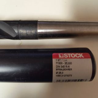 Punte elicoidale diametro 25mm, Stock, 5xD, DIN 345, HSS, Finitura superficiale: vaporizzata, Tipo: N, Direzione di taglio: destra, Profondità di lavorazione: 160 mm, nuova