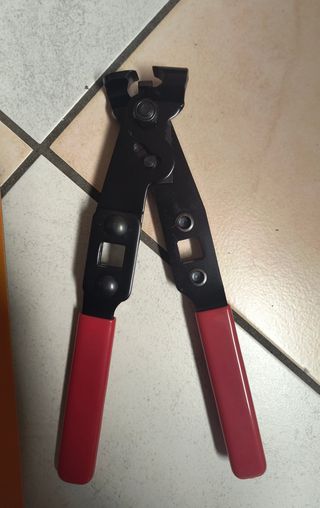 Pinza per fascette a due orecchie, Gearwrench, Sicutool, 285GL, acciaio speciale. Cerniera a fulcro variabile per diminuire lo sforzo. Attacchi quadri da 1/2" sui bracci per serraggi con chiave dinamometrica. Impugnature plastificate. Per serrare le fascette a 2 orecchie senza danneggiare il tubo. Lunghezza totale mm 235, nuova, prezzo di listino: 65€, in vendita a 39€