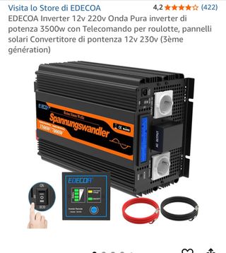Inverter EDECOA con onda pura, ideal para roulotte o pannelli solari. - Potenza 3500W (7000W picco). - Tensione di ingresso 12V. - Tensione di uscita 220V/230V AC. - Telecomando incluso.