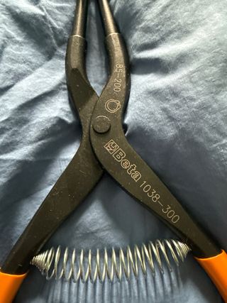 Set di due pinze Beta 1036 anelli Seeger esterni. misure : 1) 1036 140x0,9 2) 1036 140x 1,3 - Manici arancioni. - Molla di richiamo.