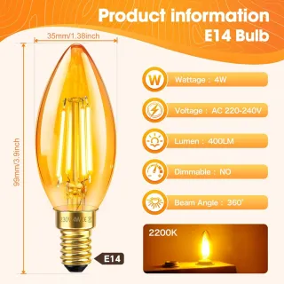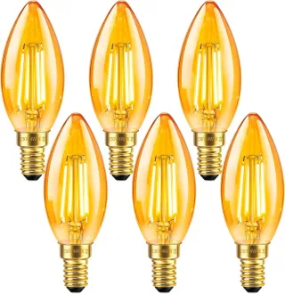 Set di 6 lampadine LED a filamento stile candela con attacco E14. - Potenza: 4W - Colore luce: Ambra (Vintage) - Tipo: Candela - Attacco: E14 - Tecnologia: LED a filamento