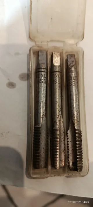 Set di tre maschi per filettare HSS-High Speed Steel 10x1,5 utilizzati per creare filettature interne (femmina) in un foro. I maschi sono attrezzi manuali o montabili su macchine che servono a intagliare filetti all'interno di un materiale, come il metallo. L'operazione di creazione di una filettatura interna è chiamata maschiatura. Spesso si usano tre maschi in sequenza per ottenere una filettatura completa: uno sbozzatore, un intermedio e un finitore. Questo processo permette di tagliare il metallo progressivamente.