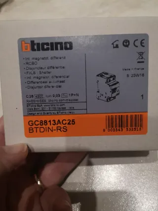 Interruttore magnetotermico differenziale Bticino. - Modello: GC8813AC25 - Tipo: RCBO - Corrente nominale: 25A - Corrente differenziale: 0,03A - Poli: 1P+N - Made in France BTDIN-RS - interruttore magnetotermico differenziale 1P+N - 4,5kA - Idn=0,03A tipo AC - 2 moduli DIN - 230V - In=25A Fino a 4 pezzi disponibili