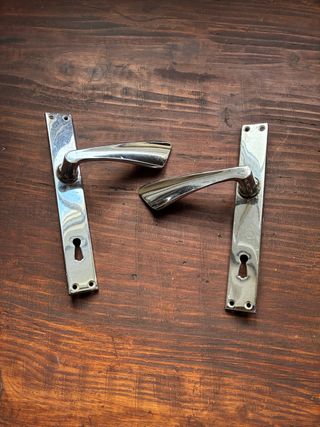 Set di due maniglie per porte in finitura cromata lucida, complete di placca. Vintage anni 50/60, ben conservate - Materiale: metallo cromato. - Design moderno e lineare. - Ideali per porte interne.