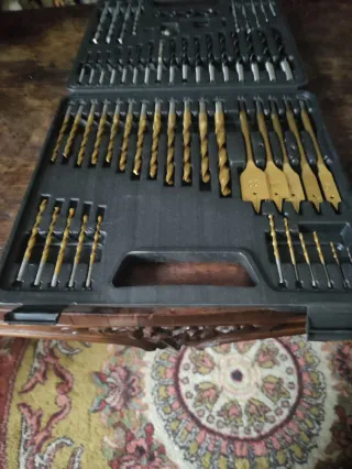 Set completo di punte per trapano e scalpelli, ideali per vari lavori. - Punte per metallo e legno. - Scalpelli piatti. - Custodia rigida per organizzazione.