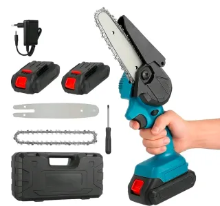 Specifiche Tecniche: 🔹 Batteria: 18V 2.0Ah (x2) 🔹 Alimentazione: 110-240V 50/60Hz 🔹 Velocità di taglio: 7M/S - 4000 r/min 🔹 Lunghezza taglio massima: 20 cm circa 🔹 Barra: 8 Pollici 🔹 Catena: 36 Maglie per taglio rapido e preciso 🔹 Doppio pulsante di protezione 📦 Contenuto della Confezione: ✅ 1x Mini Motosega ✅ 1x Boccetta per l’olio (olio non incluso) ✅ 2x Batterie ricaricabili 18V ✅ 1x Alimentatore ✅ 1x Valigetta per trasporto ✅ 1x Manuale d’uso