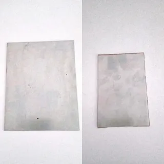 Lastre di zinco per incisione calcografia In ottime condizioni Grezza, da preparare Misure: 12,5×16cm - Materiale: zinco. - Misure: 12,5 cm x 16 cm. (Lastra a sinistra) - misure: 13 cm x 8 cm (Lastra a destra) La Lastra più piccola ha già il retro coperto per essere immersa nell'acido