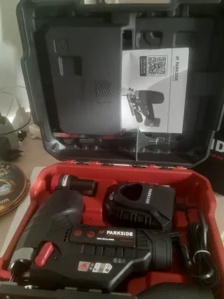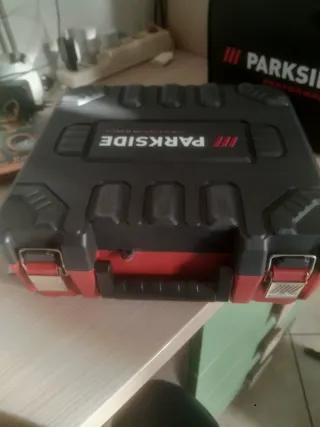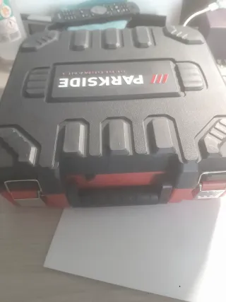 Valigetta con trapano avvitatore Parkside, completa di accessori. - Trapano avvitatore Parkside 12V. 2 Batteria 2.5Ah. 1 Caricabatterie. - Set di punte e inserti. - Valigetta rigida per trasporto.