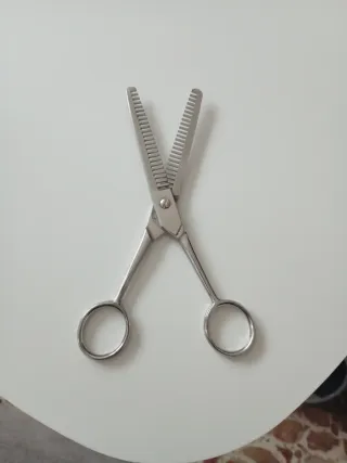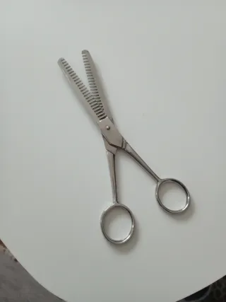 Forbici professionali in acciaio inossidabile, ideali per parrucchieri o uso domestico. - Lame seghettate per un taglio preciso. - Manici ergonomici per una presa comoda. - Materiale: acciaio inossidabile.