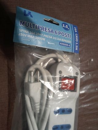 Multipresa con 6 prese bipasso comandate da interuttore, con spina da 16A con cavo da mt 1.5 . Tutto come in foto.