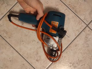 Trapano elettrico con cavo arancione. - Colore: blu e argento. - Cavo di alimentazione arancione.
