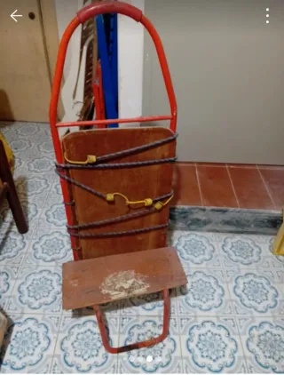 Carrello pieghevole con struttura in metallo arancione e seduta in legno. - Seduta in legno con corda per fissaggio. - Pieghevole per un facile trasporto e stoccaggio. - Sedile aggiuntivo in legno con decorazione.