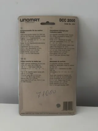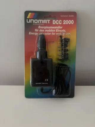 Convertitore di energia UNOMAT DCC 2000 per uso mobile. Trasformatore di energia per uso mobile. Contiene diversi tipi di spine. Nuovo, chiuso in propria confezione. Unomat Germany. - Adattatore per auto. - Include diversi connettori. - Prodotto in Germania.