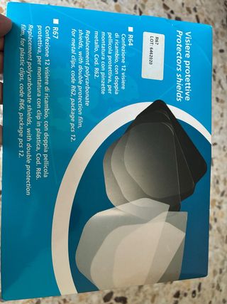 Confezione da 3 visiere protettive di ricambio. - Modello R67: per montatura con clip in plastica, con doppia pellicola protettiva. - Modello R64: per montatura con pinzette in metallo, con doppia pellicola protettiva.