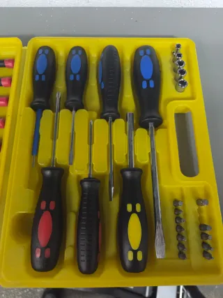 Set di giraviti con custodia gialla. Nel set manca qualcosa - Custodia in plastica resistente. - Vari tipi di punte per diversi utilizzi. - Manici ergonomici per una presa sicura.
