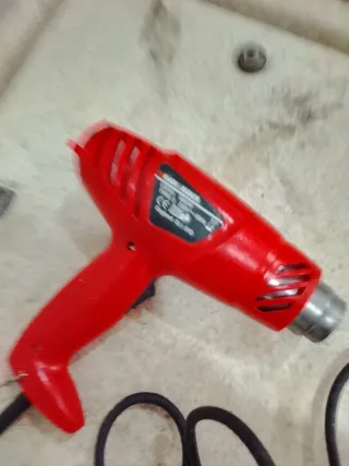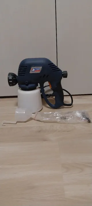 Pistola elettrica per verniciare, marca ACTER. - Serbatoio in plastica bianca. - Impugnatura ergonomica blu. - Ugello regolabile. Usata 1 volte. Funzionante