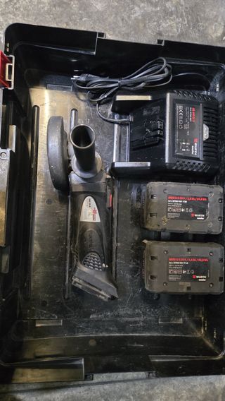Smerigliatrice angolare Milwaukee. - Colore rosso e nero. - Logo Milwaukee visibile. Con due batterie da 5 e caricatore e valigetta