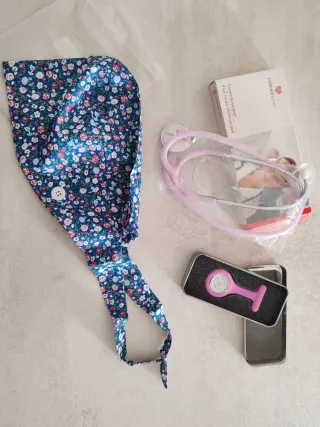 Materiale per personale medico nuovo cuffietta fantasia floreale. Il tessuto è blu con fiori rossi, bianchi e azzurri dotata di elastico. Fonendoscopio colore lilla Orologio da taschino divisa colore rosa