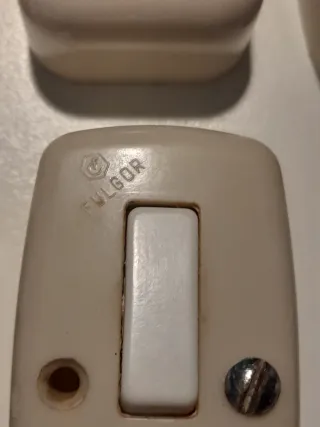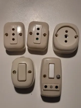 Lotto composto da 5 interruttori elettrici vintage di marche diverse: 2 Vimar, 1 Fulgor, 2 bticino. Corpo in plastica color avorio Ideali per collezionisti o restauri.