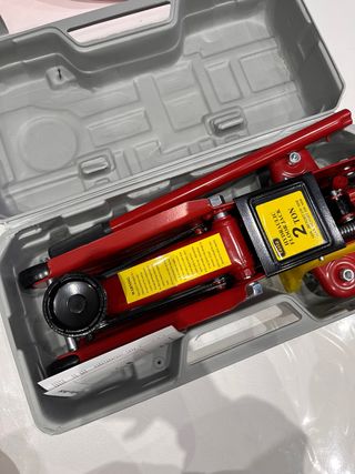 Carrello idraulico per sollevamento auto, capacità 2 tonnellate, completo di manico e istruzioni. - Colore rosso brillante. - Custodia rigida inclusa per trasporto e stoccaggio. - Manico rosso per azionamento.