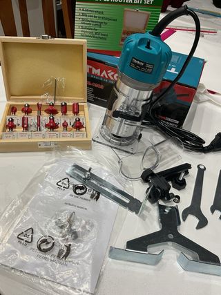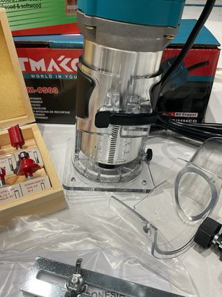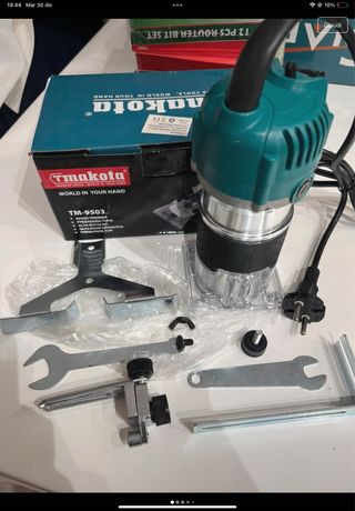 Set completo fresatrice Makota, ideale per lavori di rifinitura su legno.+ punte - Fresatrice TW-5003, 6mm. - Set da 12 punte per fresatrice con codolo da 6.35mm. - Punte con cuscinetti sigillati per un taglio preciso. - Adatto per truciolato, pannelli MDF e legno tenero/duro. - Include chiavi e accessori.