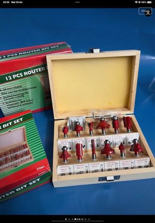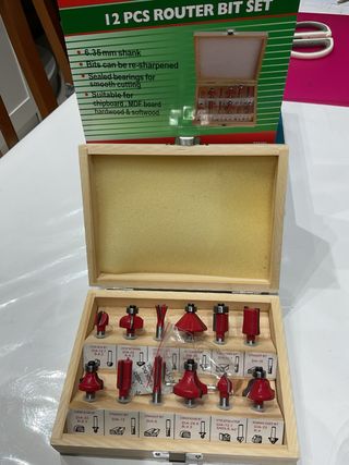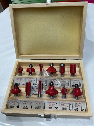 Set fresatrice per legno con 12 punte. - Mandrino da 6,35 mm. - Punte riaffilabili. - Cuscinetti sigillati per un taglio liscio. - Adatta per truciolato, pannelli MDF, legno duro e tenero.