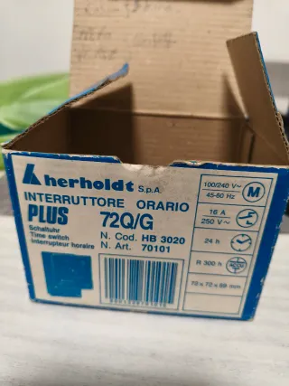Interruttore orario Aherholdt modello PLUS 72Q/G. - Tensione: 100/240 V~ - Frequenza: 45-60 Hz - Corrente: 16 A - Tensione massima: 250 V~ - Durata: 24 h - R 300 h ACCU - Dimensioni: 72 x 72 x 69 mm - Codice N.: HB 3020 - Articolo N.: 70101
