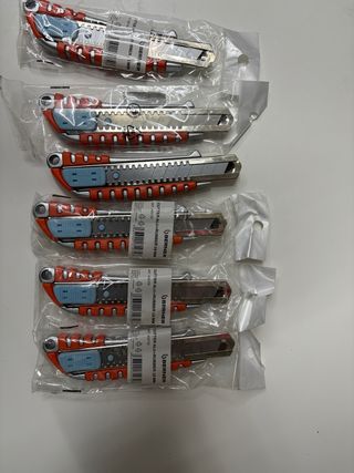 Set di 6 taglierini professionali Berner, nuovi e mai utilizzati. Ideali per lavori di precisione. - Marca: Berner - Modello: Cutter Alu-Rubber 18 mm - Materiale: Alluminio e gomma - Lama retrattile