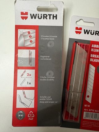 Vendo 4 confezioni di lame per cutter Würth, nuove. Ogni confezione contiene 10 lame da 18 mm a spezzare (break-off blade). Ideali per taglierini da lavoro, cartongesso, imballaggi e lavori di fai da te. Prodotto nuovo e originale Würth. - Lame da 18 mm. - Articolo: 0715 66 05. - Marca: Würth.